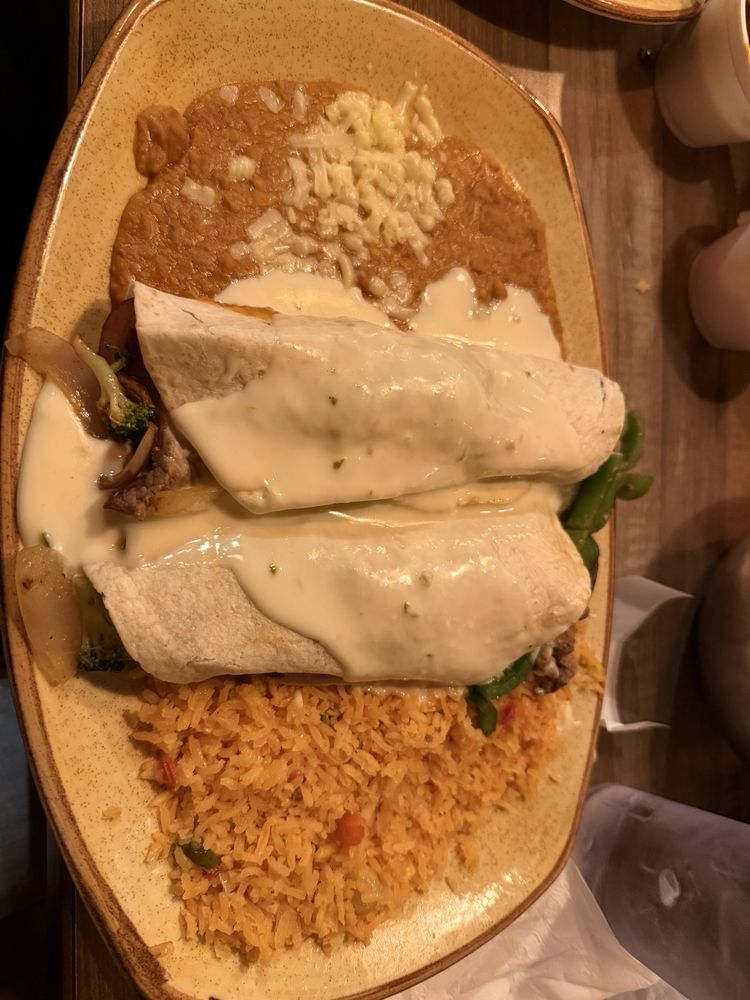 2 burritos, filled with shredded chicken, ground beef, shredded beef or seafood (baby shrimp or crabmeat). Topped with cheese sauce and served with rice and beans.